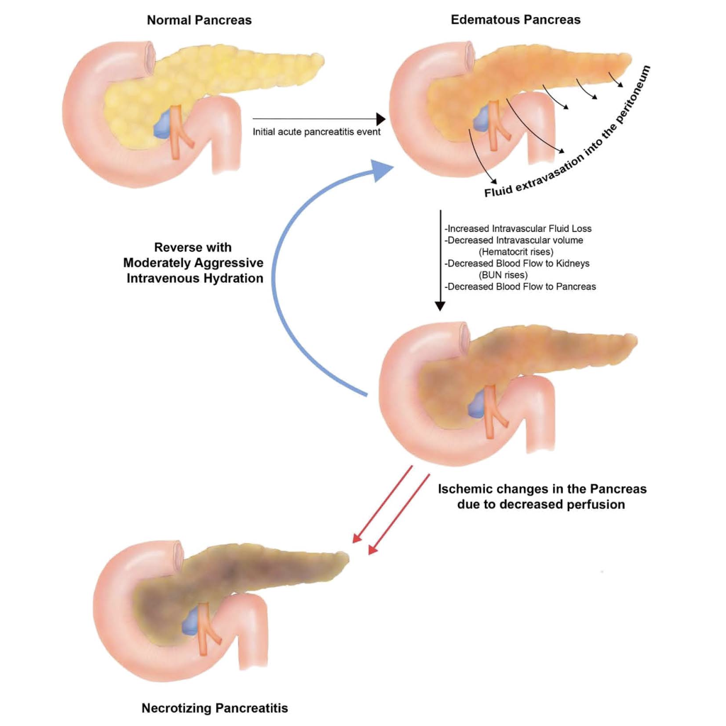 - 組織與微血管損傷: 這些高濃度 FFA 會直接破壞胰臟腺泡細胞和血管內皮細胞,引發大規模的局部缺血、發炎反應與組織壞死,從而導致急性胰臟炎。