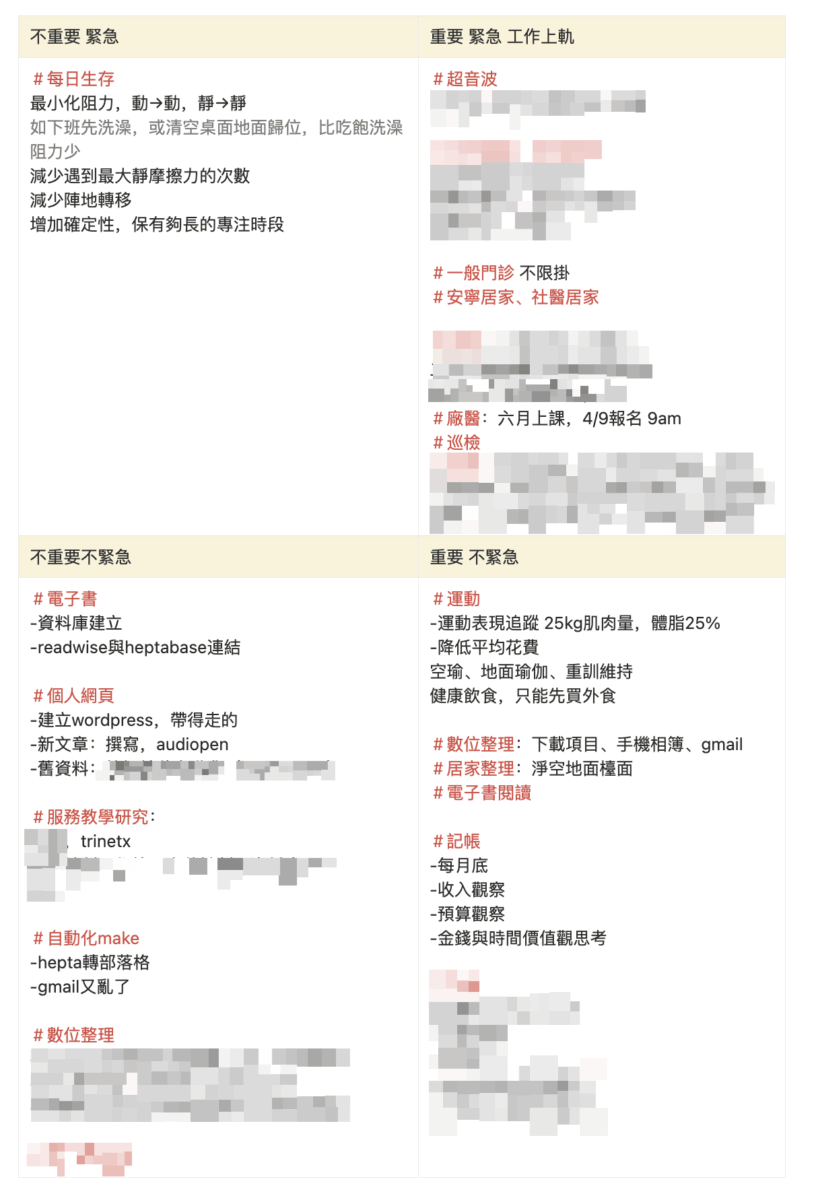 人其實很貪心,我會讓四格都平均,如電子書整理雖然對長期來說是重要的事,但如果重要的事已經太多了,我會忍痛,讓他去不重要不緊急的事,對現階段的我而言,必須取捨!